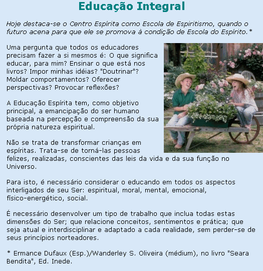 Cursos de Gestantes - Educação no Lar "A tarefa doméstica nunca será uma válvula para gozos improdutivos, porque constitui trabalho e cooperação com Deus. Debalde se improvisarão sociólogos para substituir a educação no lar por sucedâneos abstrusos que envenenam a alma. Só um espírito que haja compreendido a paternidade de Deus, acima de tudo, consegue escapar à lei pela qual os filhos sempre imitarão os pais, ainda quando sejam perversos. Ouçamos as palavras do Cristo e, se tendes filhos na terra, guardai a declaração do Mestre, como advertência. Emmanuel."